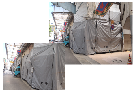 注意深く作業を行い振動、騒音を最小限におさえ、チリ、ホコリは養生シートにて、しっかり囲い、木くずや、ホコリが舞わないように作業中には水をかけて防ぎます。